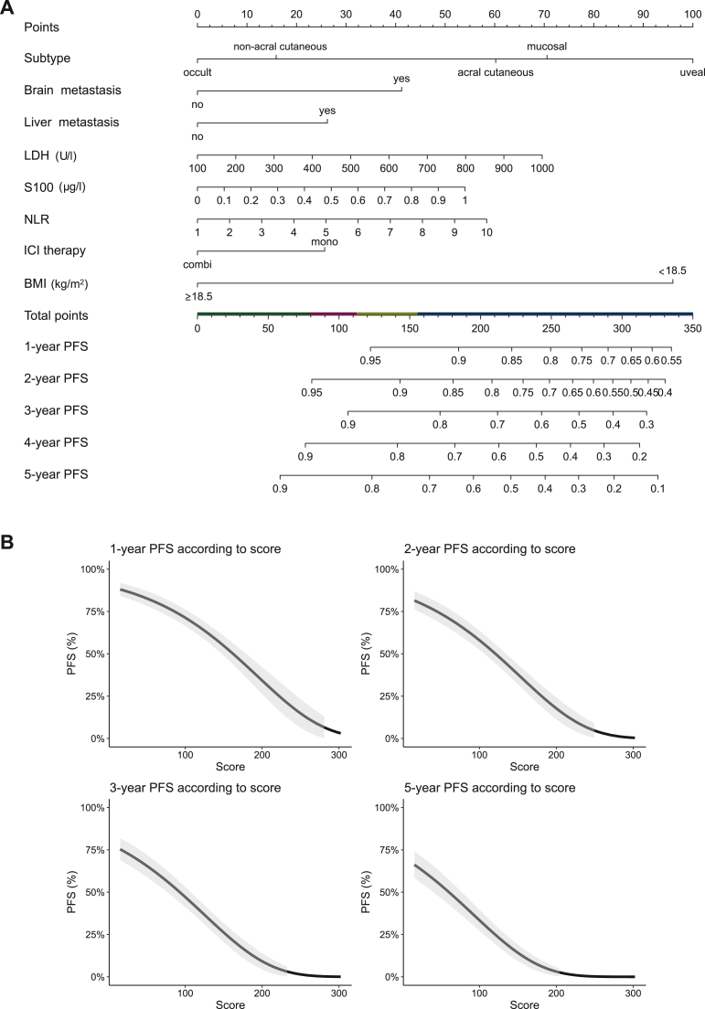 Conclusions: We developed and validated a predictive nomogram for long-term PFS in patients with unresectable stage IV melanoma undergoing first-line anti-PD-1-based immunotherapy.