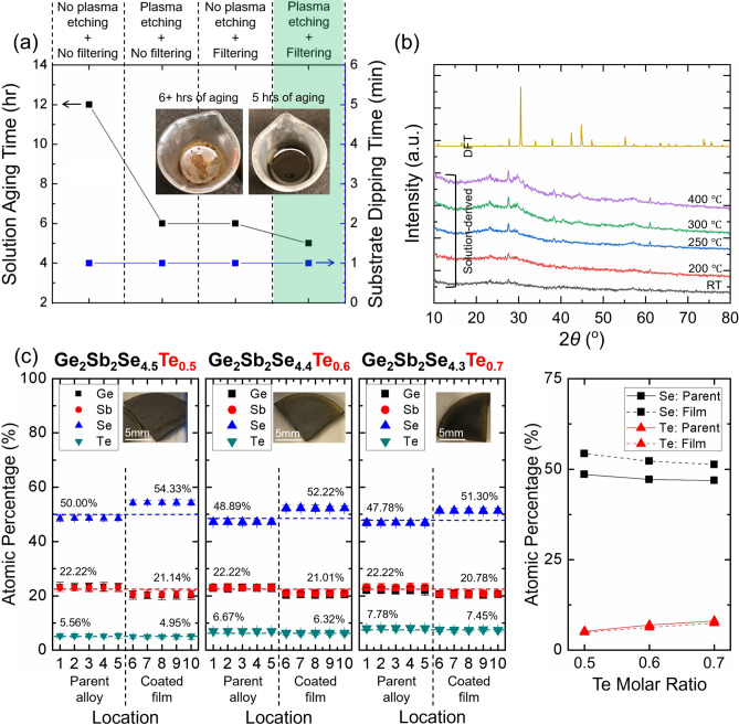 Ge-Sb-Se-Te chalcogenides, namely Se-substituted Ge-Sb-Te, have been developed as an alternative optical phase change material (PCM) with a high figure-of-merit. A need for the integration of such new PCMs onto a variety of photonic platforms has necessitated the development of fabrication processes compatible with diverse material compositions as well as substrates of varying material types, shapes, and sizes. This study explores the application of chemical solution deposition as a method capable of creating conformally coated layers and delves into the resulting modifications in the structural and optical properties of Ge-Sb-Se-Te PCMs. Specifically, we detail the solution-based deposition of Ge-Sb-Se-Te layers and present a comparative analysis with those deposited via thermal evaporation. We also discuss our ongoing endeavor to improve available choice of processing-material combinations and how to realize solution-derived high figure-of-merit optical PCM layers, which will enable a new era for the development of reconfigurable photonic devices.