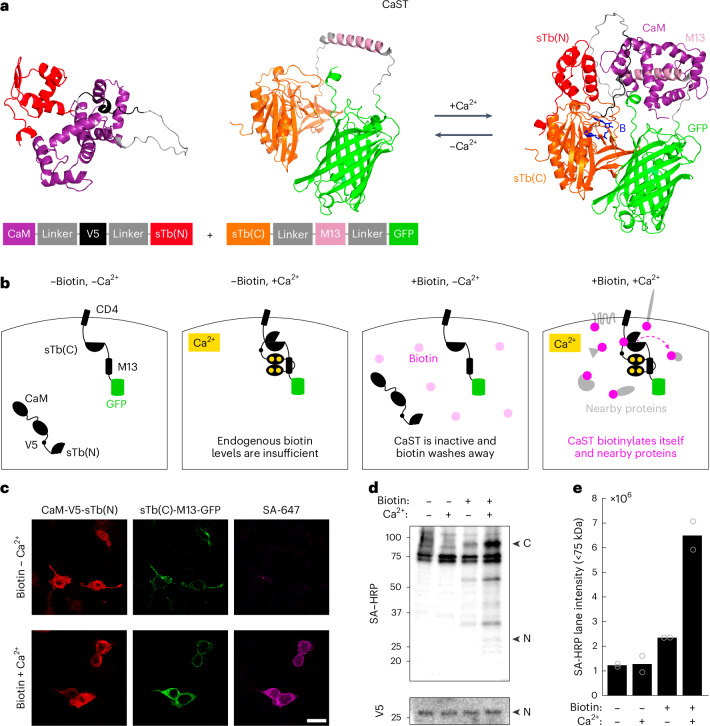 Intracellular calcium (Ca2+) is ubiquitous to cell signaling across biology. While existing fluorescent sensors and reporters can detect activated cells with elevated Ca2+ levels, these approaches require implants to deliver light to deep tissue, precluding their noninvasive use in freely behaving animals. Here we engineered an enzyme-catalyzed approach that rapidly and biochemically tags cells with elevated Ca2+ in vivo. Ca2+-activated split-TurboID (CaST) labels activated cells within 10 min with an exogenously delivered biotin molecule. The enzymatic signal increases with Ca2+ concentration and biotin labeling time, demonstrating that CaST is a time-gated integrator of total Ca2+ activity. Furthermore, the CaST readout can be performed immediately after activity labeling, in contrast to transcriptional reporters that require hours to produce signal. These capabilities allowed us to apply CaST to tag prefrontal cortex neurons activated by psilocybin, and to correlate the CaST signal with psilocybin-induced head-twitch responses in untethered mice.