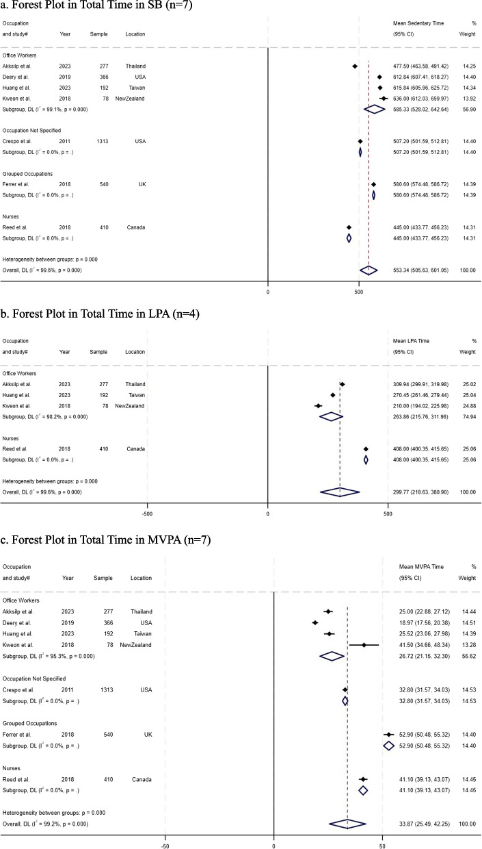 Results: We found that 63% of the studies reported daily time spent in SB and in MVPA, but fewer reported LPA, moderate PA, and vigorous PA. The average time spent in SB was 553.34 min/day, in LPA was 299.77 min/day, and in MVPA was 33.87 min/day. In occupational subgroup analysis, we observed that office workers had 2.3 h more SB, 2.4 less hours LPA, and 14 min less MVPA per day than nurses. However, most studies either did not specify workers' occupations or grouped occupations. Shift work and workplace facilities significantly influenced SB and PA, but organizational factors affecting these behaviors were not sufficiently investigated (e.g., occupation type, work environment and workplace facilities, and shift work).