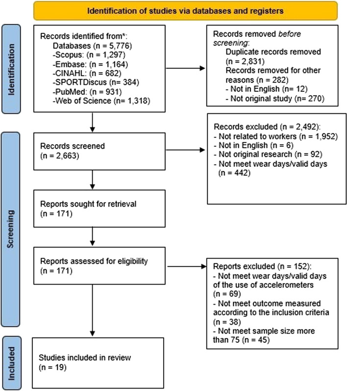 Methods: A literature search of six databases was performed for relevant studies published through March 2023. Eligible studies were in English, targeted working populations, had a sample size > 75, and objectively measured both SB and PA for seven consecutive days using accelerometers. Following PRISMA guidelines, 5,197 studies were identified, and 19 articles met our inclusion criteria. Five of these studies were included in a meta-analysis comparing time spent in SB, light PA (LPA), and moderate to vigorous PA (MVPA) across occupations. Methodological quality was assessed using a Joanna Briggs Institute tool.