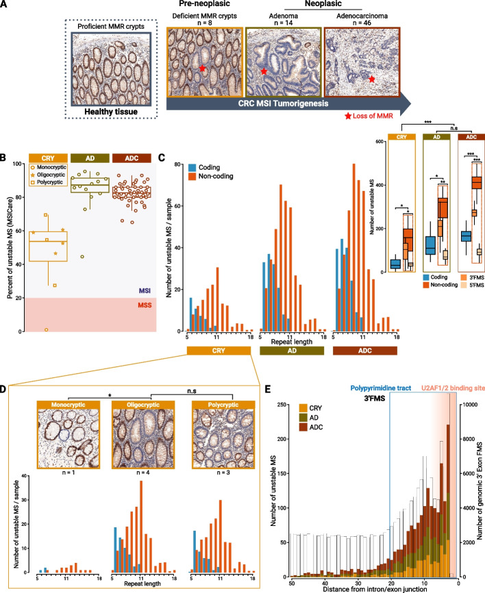 Background: Microsatellite instability (MSI) due to mismatch repair deficiency (dMMR) is common in colorectal cancer (CRC). These cancers are associated with somatic coding events, but the noncoding pathophysiological impact of this genomic instability is yet poorly understood. Here, we perform an analysis of coding and noncoding MSI events at the different steps of colorectal tumorigenesis using whole exome sequencing and search for associated splicing events via RNA sequencing at the bulk-tumor and single-cell levels.