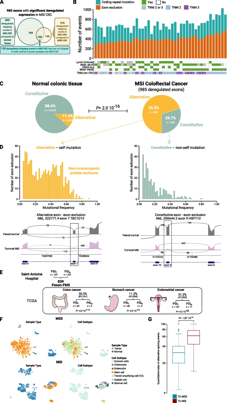 Results: Our results demonstrate that MSI leads to hundreds of noncoding DNA mutations, notably at polypyrimidine U2AF RNA-binding sites which are endowed with cis-activity in splicing, while higher frequency of exon skipping events are observed in the mRNAs of MSI compared to non-MSI CRC. At the DNA level, these noncoding MSI mutations occur very early prior to cell transformation in the dMMR colonic crypt, accounting for only a fraction of the exon skipping in MSI CRC. At the RNA level, the aberrant exon skipping signature is likely to impair colonic cell differentiation in MSI CRC affecting the expression of alternative exons encoding protein isoforms governing cell fate, while also targeting constitutive exons, making dMMR cells immunogenic in early stage before the onset of coding mutations. This signature is characterized by its similarity to the oncogenic U2AF1-S34F splicing mutation observed in several other non-MSI cancer.