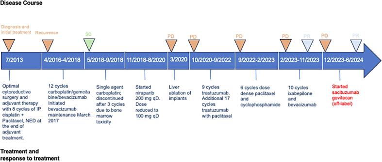Case: A 69-year-old with recurrent, metastatic, platinum-resistant HGSOC overexpressing TROP2 experienced a significant response to the antibody-drug conjugate (ADC) sacituzumab govitecan after multiple failed lines of chemotherapy and targeted treatment. Following sacituzumab govitecan treatment she experienced a confirmed partial response as well as a return of CA-125 to baseline. Having now completed 8 cycles (ie, over 6 months of treatment), her disease continues to demonstrate a response to sacituzumab govitecan treatment. The ADC has been well tolerated at a dose of 10 mg/kg with no dose-limiting toxicity or need for dose reductions.