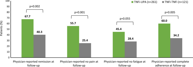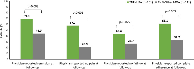 Results: Of 503 patients who switched from their first TNFi, 261 were in TNFi-UPA, 128 in TNFi-TNFi, and 114 in TNFi-other MOA groups. At the time of switch, most patients had moderate/high disease activity (TNFi-UPA: 73%; TNFi-TNFi: 52%; TNFi-other MOA: 60%). After adjustment for differences in characteristics at point of switch, patients in TNFi-UPA group (n = 261) were significantly more likely to achieve physician-reported remission (67.7% vs. 40.3%; p = 0.0015), no pain (55.7% vs. 25.4%; p = 0.0007), and complete adherence (60.0% vs. 34.2%; p = 0.0049) compared with patients in TNFi-TNFi group (n = 121). Similar findings were observed for TNFi-UPA versus TNFi-other MOA groups (n = 111).