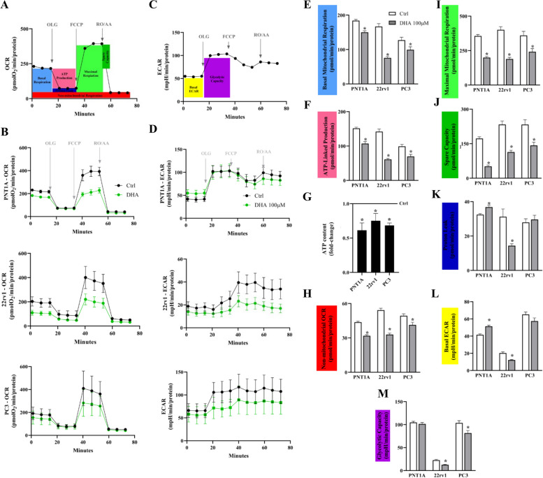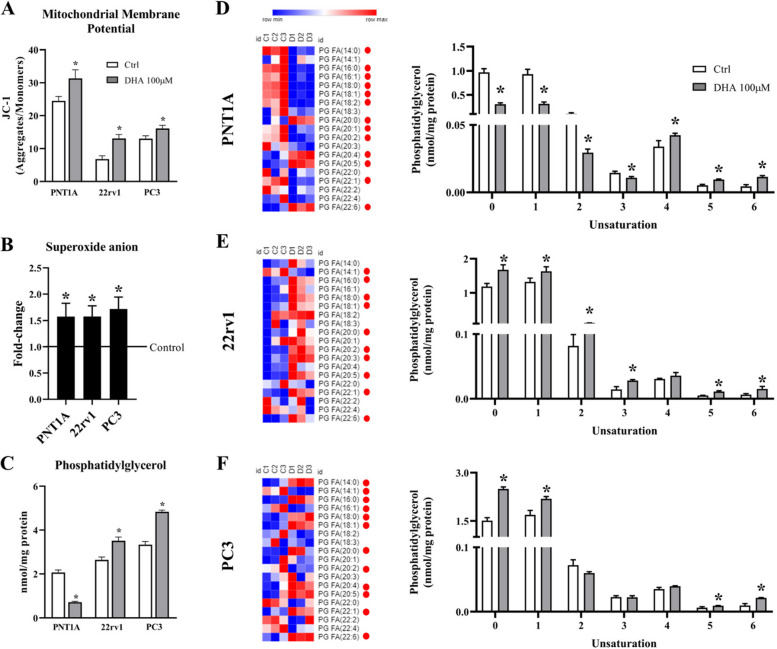Methods: Here, we evaluated mitochondrial function of non-malignant PNT1A and the castration-resistant (CRPC) prostate 22Rv1 and PC3 cell lines in response to DHA incubation. For this purpose, we used Seahorse extracellular flux assay to assess mitochondria function, [14C]-glucose to evaluate its oxidation as well as its contribution to fatty acid synthesis, 1H-NMR for metabolite profile determination, MitoSOX for superoxide anion production, JC-1 for mitochondrial membrane polarization, mass spectrometry for determination of phosphatidylglycerol levels and composition, staining with MitoTracker dye to assess mitochondrial morphology under super-resolution in addition to Transmission Electron Microscopy, In-Cell ELISA for COX-I and SDH-A protein expression and flow cytometry (Annexin V and 7-AAD) for cell death estimation.