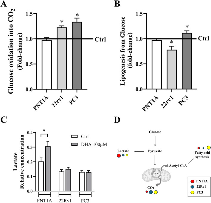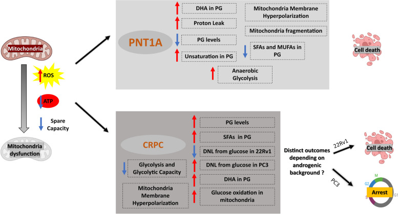 Results: In all cell lines DHA decreased basal respiratory activity, ATP production, and the spare capacity in mitochondria. Also, the omega-3 induced mitochondrial hyperpolarization, ROS overproduction and changes in membrane phosphatidylglycerol composition. In PNT1A, DHA led to mitochondrial fragmentation and it increased glycolysis while in cancer cells it stimulated glucose oxidation, but decreased de novo lipogenesis specifically in 22Rv1, indicating a metabolic shift. In all cell lines, DHA modulated several metabolites related to energy metabolism and it was incorporated in phosphatidylglycerol, a precursor of cardiolipin, increasing the unsaturation index in the mitochondrial membrane. Accordingly, DHA triggered cell death mainly in PNT1A and 22Rv1.