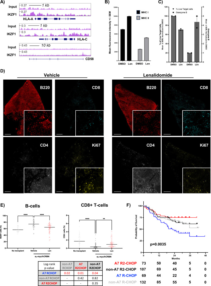 Immunochemotherapy has been the mainstay of treatment for newly diagnosed diffuse large B-cell lymphoma (ndDLBCL) yet is inadequate for many patients. In this work, we perform unsupervised clustering on transcriptomic features from a large cohort of ndDLBCL patients and identify seven clusters, one called A7 with poor prognosis, and develop a classifier to identify these clusters in independent ndDLBCL cohorts. This high-risk cluster is enriched for activated B-cell cell-of-origin, low immune infiltration, high MYC expression, and copy number aberrations. We compare and contrast our methodology with recent DLBCL classifiers to contextualize our clusters and show improved prognostic utility. Finally, using pre-clinical models, we demonstrate a mechanistic rationale for IKZF1/3 degraders such as lenalidomide to overcome the low immune infiltration phenotype of A7 by inducing T-cell trafficking into tumors and upregulating MHC I and II on tumor cells, and demonstrate that TCF4 is an important regulator of MYC-related biology in A7.