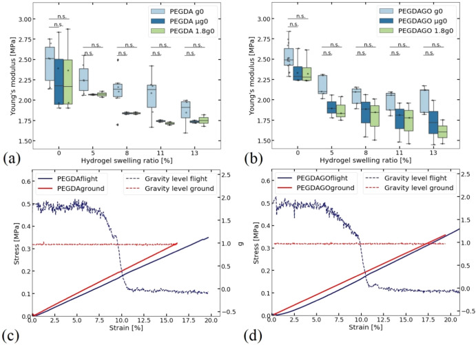 Exposure to altered gravity influences cellular behaviour in cell cultures. Hydrogels are amongst the most common materials used to produce tissue-engineering scaffolds, and their mechanical properties play a crucial role in cell-matrix interaction. However, little is known about the influence of altered gravity on hydrogel properties. Here we study the mechanical properties of Poly (ethylene glycol) diacrylate (PEGDA) and PEGDA incorporated with graphene oxide (GO) by performing tensile tests in micro and hypergravity during a Parabolic flight campaign, and by comparing them to the same tests performed in Earth gravity. We show that gravity levels do not result in a statistically significant difference in Young's modulus.