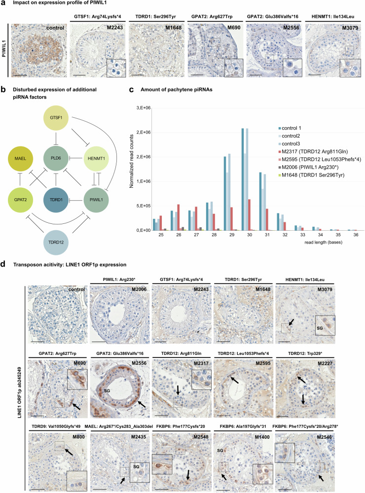 piRNAs are crucial for transposon silencing, germ cell maturation, and fertility in male mice. Here, we report on the genetic landscape of piRNA dysfunction in humans and present 39 infertile men carrying biallelic variants in 14 different piRNA pathway genes, including PIWIL1, GTSF1, GPAT2, MAEL, TDRD1, and DDX4. In some affected men, the testicular phenotypes differ from those of the respective knockout mice and range from complete germ cell loss to the production of a few morphologically abnormal sperm. A reduced number of pachytene piRNAs was detected in the testicular tissue of variant carriers, demonstrating impaired piRNA biogenesis. Furthermore, LINE1 expression in spermatogonia links impaired piRNA biogenesis to transposon de-silencing and serves to classify variants as functionally relevant. These results establish the disrupted piRNA pathway as a major cause of human spermatogenic failure and provide insights into transposon silencing in human male germ cells.