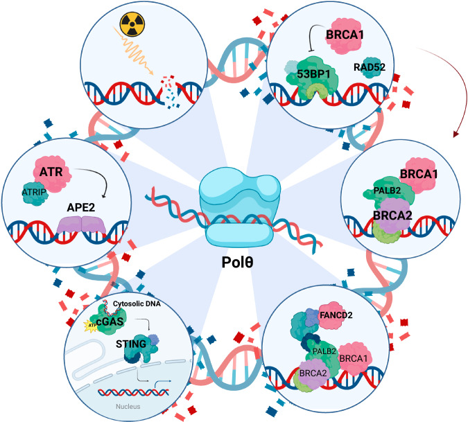 The most remarkable finding in synthetic lethality (SL) is the hypersensitivity to PARP inhibitors (PARPis) of the tumors harboring defects in genes involved in homologous repair (HR) such as BRCA1/2. Despite initial responsiveness to PARPi, the penetrance of the synthetic lethal interactions between BRCA1/2 genes and PARPi is incomplete. Thus, a significant proportion of HR-defective tumors experience intrinsic or acquired resistance, representing a key challenge of clinical research. An expanded concept of SL is opening new ways and includes novel forms of genetic interactions, investigating not only traditional SL of pairs genes but also SL between biological pathways that regulate the same essential survival cell function. In this context, recent research showed that HR and theta-mediated end-joining (TMEJ) pathways exhibit SL. DNA polymerase theta (Polθ) is encoded by the POLQ gene and is a key component of the TMEJ, an essential backup pathway, intrinsically mutagenic, to repair resected double-strand breaks (DSBs) when the non-homologous end joining (NHEJ) and HR are impaired. Polθ is broadly expressed in normal tissues, overexpressed in several cancers, and typically associated with poor outcomes and shorter relapse-free survival. Notably, HR-deficient tumor cells present the characteristic mutational signatures of the error-prone TMEJ pathway. According to this observation, the loss of HR proteins, such as BRCA1 or BRCA2, contributes to increasing the TMEJ-specific genomic profile, suggesting synthetic lethal interactions between loss of the POLQ and HR genes, and resulting in the emerging interest for Polθ as a potential therapeutic target in BRCA1/2-associated tumors.This review summarizes the converging roles of the POLQ and HR genes in DNA DSB repair, the early-stage clinical trials using Polθ inhibitor to treat HR-defective tumors and to overcome BRCA-reversion mutations responsible for therapeutic resistance, and the novel pleiotropic effects of Polθ, paving the way for the development of unexplored synthetic lethality strategies.