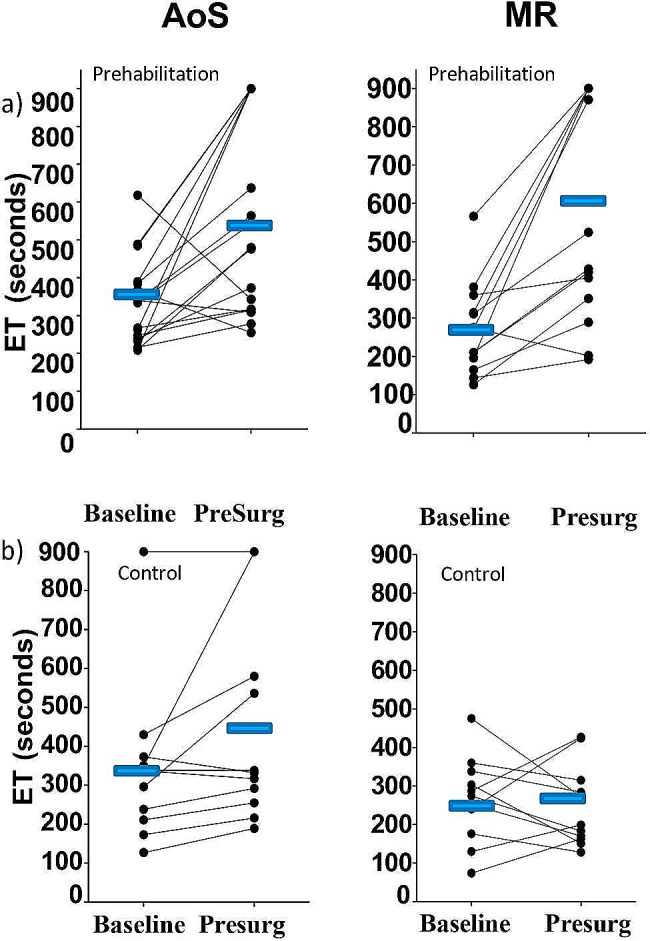 Results: 68 patients were included in this secondary analysis, 34 (20 AoS and 14 MR) were allocated to the prehabilitation group and 34 (20 AoS and 14 MR) to control group. At baseline, patients with AoS had better left systolic ventricular function and lower prevalence of atrial fibrillation compared to MR (p = 0.022 and p = 0.035 respectively). After prehabilitation program, patients with MR showed greater improvement in ET than AoS patients (101% vs. 66% increase from baseline). No adverse events related to the prehabilitation program were observed.