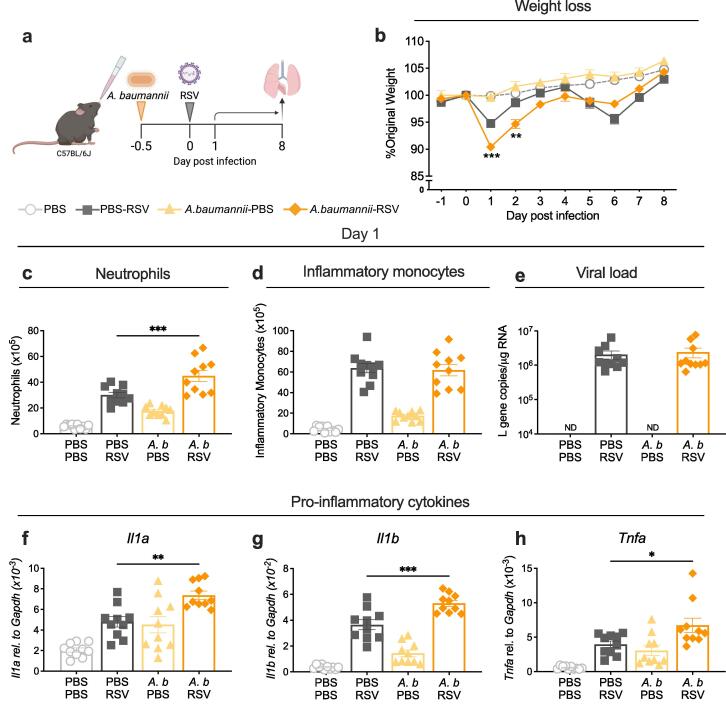 Respiratory syncytial virus (RSV) can cause severe lower respiratory tract infections. Understanding why some individuals get more serious disease may help with diagnosis and treatment. One possible risk factor underlying severe disease is bacterial exposure before RSV infection. Bacterial exposure has been associated with increased respiratory viral-induced disease severity but the mechanism remains unknown. Respiratory bacterial infections or exposure to their pathogen associated molecular patterns (PAMPs) trigger innate immune inflammation, characterised by neutrophil and inflammatory monocyte recruitment and the production of inflammatory cytokines. We hypothesise that these changes to the lung environment alter the immune response and disease severity during subsequent RSV infection. To test this, we intranasally exposed mice to LPS, LTA or Acinetobacter baumannii (an airway bacterial pathogen) before RSV infection and observed an early induction of disease, measured by weight loss, at days 1-3 after infection. Neutrophils or inflammatory monocytes were not responsible for driving this exacerbated weight loss. Instead, exacerbated disease was associated with increased IL-1α and TNF-α, which orchestrated the recruitment of innate immune cells into the lung. This study shows that exposure to bacterial PAMPs prior to RSV infection increases the expression of IL-1α and TNF-α, which dysregulate the immune response resulting in exacerbated disease.
