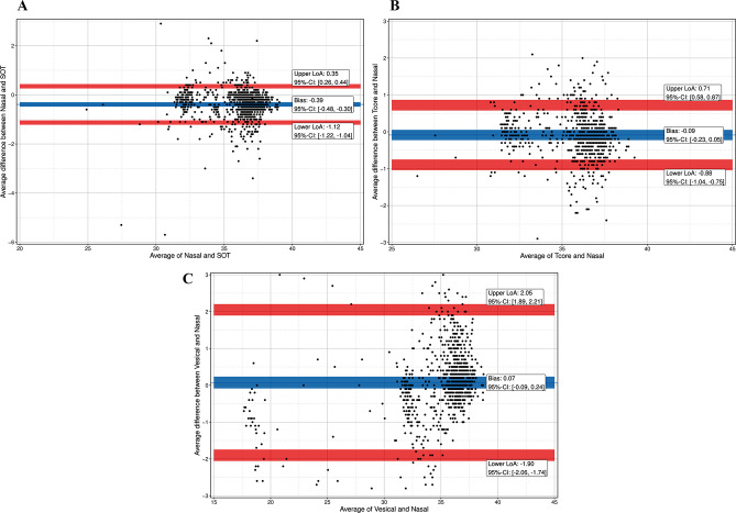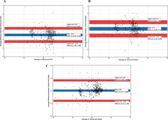 During surgery for congenital heart disease (CHD) temperature management is crucial. Vesical (Tves) and nasopharyngeal (TNPH) temperature are usually measured. Whereas Tves slowly responds to temperature changes, TNPH carries the risk of bleeding. The zero-heat-flux (ZHF) temperature monitoring systems SpotOn™ (TSpotOn), and Tcore™ (Tcore) measure temperature non-invasively. We evaluated accuracy and precision of the non-invasive devices, and of Tves compared to TNPH for estimating temperature. In this prospective observational study in pediatric and adult patients accuracy and precision of TSpotOn, Tcore, and Tves were analyzed using the Bland-Altman method. Proportion of differences (PoD) and Lin´s concordance correlation coefficient (LCC) were calculated. Data of 47 patients resulted in sets of matched measurements: 1073 for TSpotOn vs. TNPH, 874 for Tcore vs. TNPH, and 1102 for Tves vs. TNPH. Accuracy was - 0.39 °C for TSpotOn, -0.09 °C for Tcore, and 0.07 °C for Tves. Precisison was between - 1.12 and 0.35 °C for TSpotOn, -0.88 to 0.71 °C for Tcore, and - 1.90 to 2.05 °C for Tves. PoD ≤ 0.5 °C were 71% for TSpotOn, 71% for Tcore, and 60% for Tves. LCC was 0.9455 for TSpotOn, 0.9510 for Tcore, and 0.9322 for Tves. Temperatures below 25.2 °C (TSpotOn) or 27.1 (Tcore) could not be recorded non-invasively, but only with Tves. Trial registration German Clinical Trials Register, DRKS00010720.