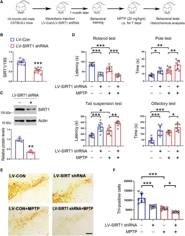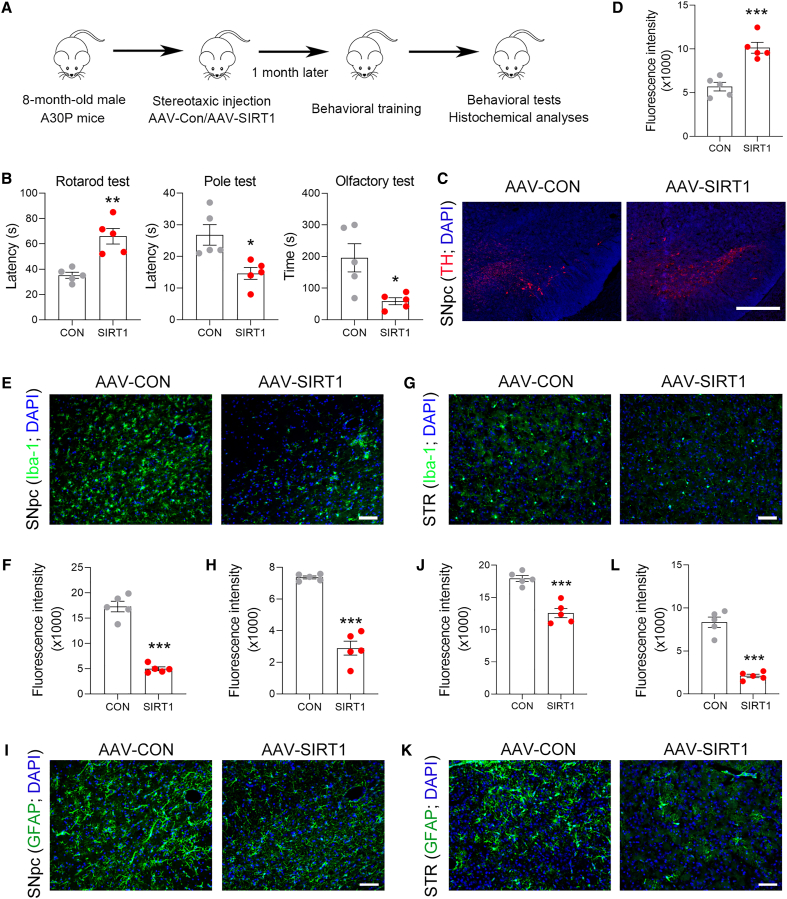 Sirtuin 1 (SIRT1) is a histone deacetylase and plays diverse functions in various physiological events, from development to lifespan regulation. Here, in Parkinson's disease (PD) model mice, we demonstrated that SIRT1 ameliorates parkinsonism, while SIRT1 knockdown further aggravates PD phenotypes. Mechanistically, SIRT1 interacts with and deacetylates pyruvate kinase M2 (PKM2) at K135 and K206, thus leading to reduced PKM2 enzyme activity and lactate production, which eventually results in decreased glial activation in the brain. Administration of lactate in the brain recapitulates PD-like phenotypes. Furthermore, increased expression of PKM2 worsens PD symptoms, and, on the contrary, inhibition of PKM2 by shikonin or PKM2-IN-1 alleviates parkinsonism in mice. Collectively, our data indicate that excessive lactate in the brain might be involved in the progression of PD. By improving lactate homeostasis, SIRT1, together with PKM2, are likely drug targets for developing agents for the treatment of neurodegeneration in PD.