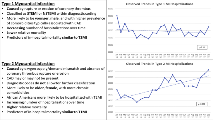 Results: During the 24-month study period, 1,789,485 (76%) patients were admitted with type 1 myocardial infarction (T1MI) and 563,695 (24%) were admitted with T2MI. Patients with T2MI were more likely to be older (71 vs 68 years; P < .001) and female (47.5% vs 38.3%; P < .001), with fewer comorbidities related to coronary atherosclerosis. African Americans were the only race with a significantly higher rate of hospitalization for T2MI (15.9% vs 11.6%; P < .001). The predictors of mortality were similar in both the T2MI and T1MI cohorts. Sepsis (23.47%), hypertensive heart disease (15.35%), and atrial arrhythmias (4.49%) were the most common principal diagnoses for T2MI. T2MI hospitalizations trended consistently upward during the study period. Monthly in-hospital mortality rates were consistently higher for T2MI versus T1MI (P < .001).