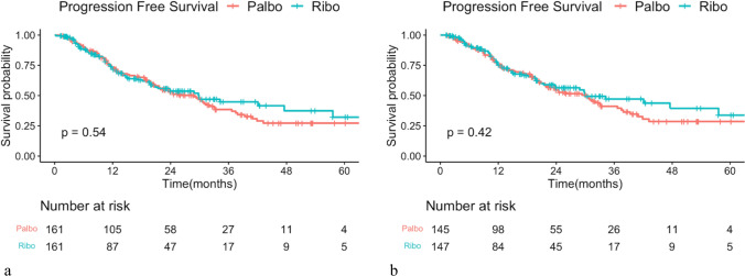 Results: Patients receiving ribociclib and palbociclib showed no significant differences in age, histology, body mass index(BMI), or pathologic status. The distribution of disease status and endocrine therapy partners was comparable between the two groups. Dose reduction was similar, while patients with palbociclib tended to discontinue CDK4/6i usage, and those with ribociclib tended to switch to the other CDK4/6i or endocrine partners. There was no significant difference in progression-free survival (PFS) between the two CDK4/6i in the first-line setting. Adverse prognostic factors were increasing HER2 IHC score, higher Ki-67 levels, visceral and liver metastasis, prior chemotherapy, and endocrine therapy resistance, while higher BMI, bone-only metastasis, and letrozole treatment were associated with a lower risk of progression. The limited follow-up time in our study was insufficient to assess the outcomes of patients treated with interrupted CDK4/6i for up to two years under the NHI reimbursement policy.