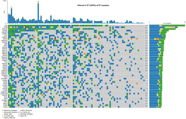 Breast cancer (BC) has emerged as the most common malignancy among females. The genomic profile of BC is diverse in nature and complex due to heterogeneity among various geographically different ethnic groups. The primary objective of this study was to carry out a comprehensive mutational analysis of Indian BC cases by performing whole exome sequencing. The cohort included patients with a median age of 48 years. TTN, TP53, MUC16, SYNE1, and OBSCN were the frequently altered genes found in our cohort. The PIK3CA and KLC3 genes are driver genes implicated in various cellular functions and cargo transportation through microtubules, respectively. Except for CCDC168 and PIK3CA, several gene pairings were found to be significantly linked with co-occurrence. Irrespective of their hormonal receptor status, RTK/RAS was observed with frequently altered signaling pathways. Further analysis of the mutational signature revealed that SBS13, SBS6, and SBS29 were mainly observed in our cohort. This study supplements the discovery of diagnostic biomarkers and provides new therapeutic options for the improved management of BC.