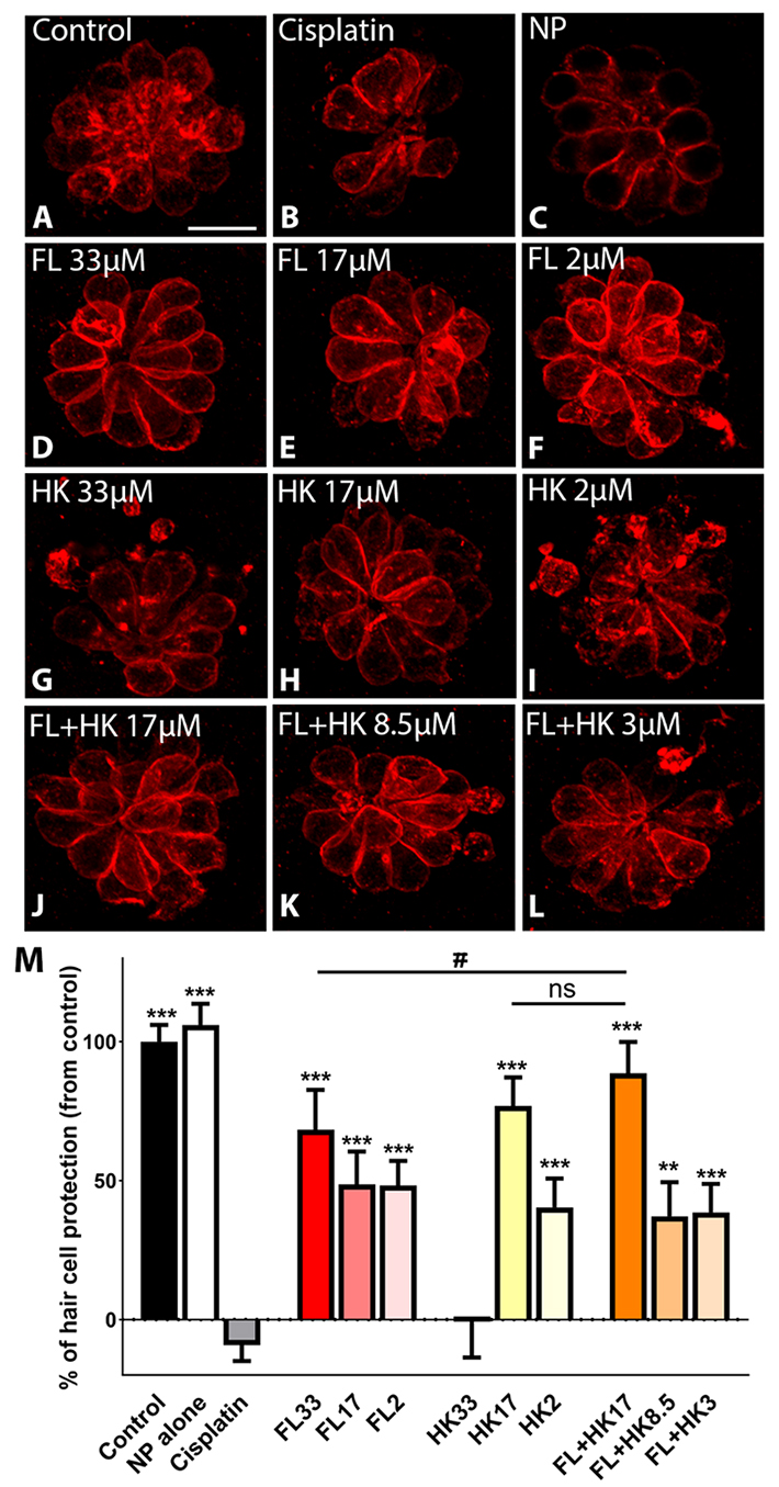 Treatment-induced ototoxicity and accompanying hearing loss are a great concern associated with chemotherapeutic or antibiotic drug regimens. Thus, prophylactic cure or early treatment is desirable by local delivery to the inner ear. In this study, we examined a novel way of intratympanically delivered sustained nanoformulation by using crosslinked hybrid nanoparticle (cHy-NPs) in a thermoresponsive hydrogel i.e. thermogel that can potentially provide a safe and effective treatment towards the treatment-induced or drug-induced ototoxicity. The prophylactic treatment of the ototoxicity can be achieved by using two therapeutic molecules, Flunarizine (FL: T-type calcium channel blocker) and Honokiol (HK: antioxidant) co-encapsulated in the same delivery system. Here we investigated, FL and HK as cytoprotective molecules against cisplatin-induced toxic effects in the House Ear Institute - Organ of Corti 1 (HEI-OC1) cells and in vivo assessments on the neuromast hair cell protection in the zebrafish lateral line. We observed that cytotoxic protective effect can be enhanced by using FL and HK in combination and developing a robust drug delivery formulation. Therefore, FL-and HK-loaded crosslinked hybrid nanoparticles (FL-cHy-NPs and HK-cHy-NPs) were synthesized using a quality-by-design approach (QbD) in which design of experiment-central composite design (DoE-CCD) following the standard least-square model was used for nanoformulation optimization. The physicochemical characterization of FL and HK loaded-NPs suggested the successful synthesis of spherical NPs with polydispersity index < 0.3, drugs encapsulation (> 75%), drugs loading (~ 10%), stability (> 2 months) in the neutral solution, and appropriate cryoprotectant selection. We assessed caspase 3/7 apopototic pathway in vitro that showed significantly reduced signals of caspase 3/7 activation after the FL-cHy-NPs and HK-cHy-NPs (alone or in combination) compared to the CisPt. The final formulation i.e. crosslinked-hybrid-nanoparticle-embedded-in-thermogel was developed by incorporating drug-loaded cHy-NPs in poloxamer-407, poloxamer-188, and carbomer-940-based hydrogel. A combination of artificial intelligence (AI)-based qualitative and quantitative image analysis determined the particle size and distribution throughout the visible segment. The developed formulation was able to release the FL and HK for at least a month. Overall, a highly stable nanoformulation was successfully developed for combating treatment-induced or drug-induced ototoxicity via local administration to the inner ear.