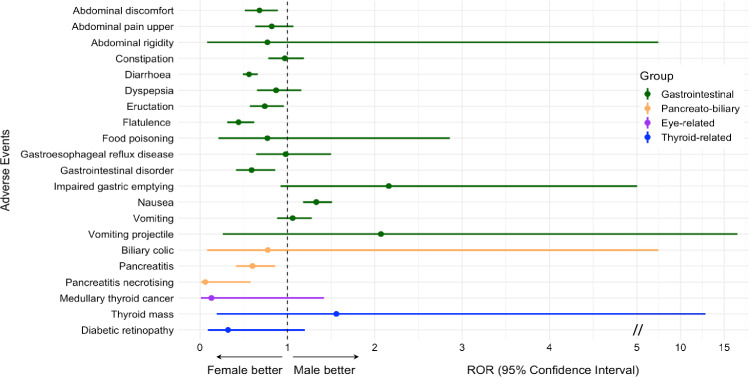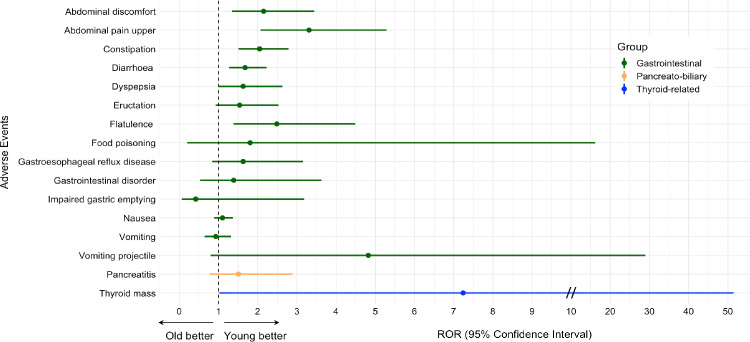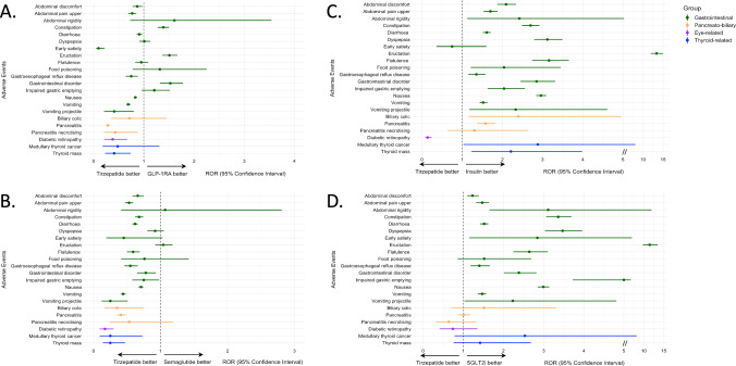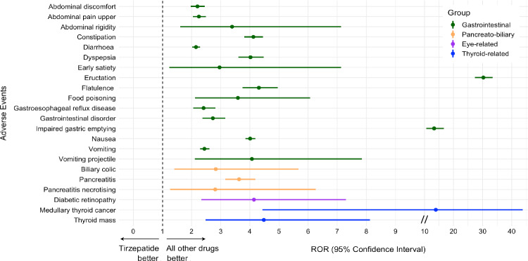 Results: Disproportionate reporting of GI [i.e., nausea (ROR 4.01, 95% CI 3.85-4.19)] and pancreato-biliary disorders [i.e., pancreatitis (ROR 3.63, 95% CI 3.15-4.19)], diabetic retinopathy (ROR 4.14, 95% CI 2.34-7.30), and medullary thyroid cancer (ROR 13.67, 95% CI 4.35-42.96) was detected. TZP exhibited a similar risk of GI AE and medullary thyroid cancer and a lower risk of most pancreato-biliary AE and diabetic retinopathy vs. GLP-1RA.