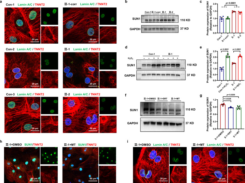 Mutations in the nuclear envelope (NE) protein lamin A/C (encoded by LMNA), cause a severe form of dilated cardiomyopathy (DCM) with early-onset life-threatening arrhythmias. However, molecular mechanisms underlying increased arrhythmogenesis in LMNA-related DCM (LMNA-DCM) remain largely unknown. Here we show that a frameshift mutation in LMNA causes abnormal Ca2+ handling, arrhythmias and disformed NE in LMNA-DCM patient-specific iPSC-derived cardiomyocytes (iPSC-CMs). Mechanistically, lamin A interacts with sirtuin 1 (SIRT1) where mutant lamin A/C accelerates degradation of SIRT1, leading to mitochondrial dysfunction and oxidative stress. Elevated reactive oxygen species (ROS) then activates the Ca2+/calmodulin-dependent protein kinase II (CaMKII)-ryanodine receptor 2 (RYR2) pathway and aggravates the accumulation of SUN1 in mutant iPSC-CMs, contributing to arrhythmias and NE deformation, respectively. Taken together, the lamin A/C deficiency-mediated ROS disorder is revealed as central to LMNA-DCM development. Manipulation of impaired SIRT1 activity and excessive oxidative stress is a potential future therapeutic strategy for LMNA-DCM.