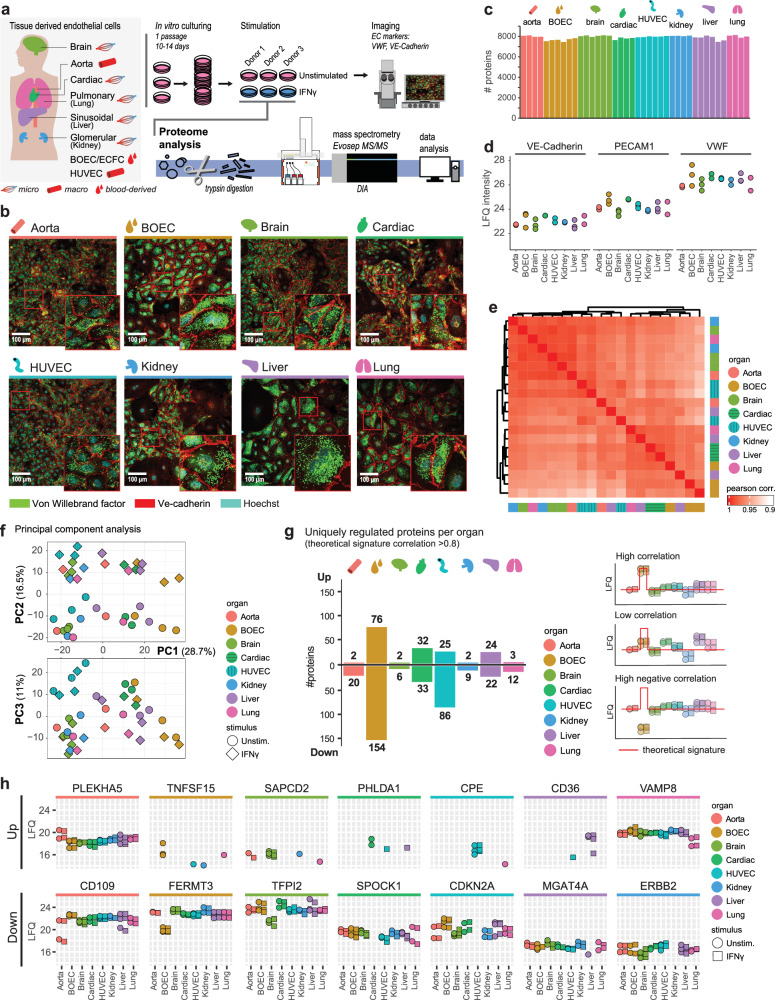 Blood vessel endothelial cells (EC) display heterogeneity across vascular beds, which is anticipated to drive site-specific vascular pathology. This heterogeneity is assessed using transcriptomics in vivo, and functional assays in vitro, but how proteomes compare across human in vitro cultured ECs remains incompletely characterized. We generated an in-depth human EC proteomic landscape (>8000 proteins) across six organs and two in vitro models in steady-state and upon IFNγ-induced inflammation. EC proteomes displayed a high similarity and organ-specific proteins were limited. Variation between ECs was mainly based on proliferation and differentiation processes in which Blood outgrowth endothelial cells (BOEC) and Human umbilical vein cells (HUVEC) represented the extremes of proteomic phenotypes. The IFNγ response was highly conserved across all samples. Harnessing dynamics in protein abundances we delineated VWF and VE-Cadherin correlation networks. This EC landscape provides an extensive proteomic addition in studying EC biology and heterogeneity from an in vitro perspective.