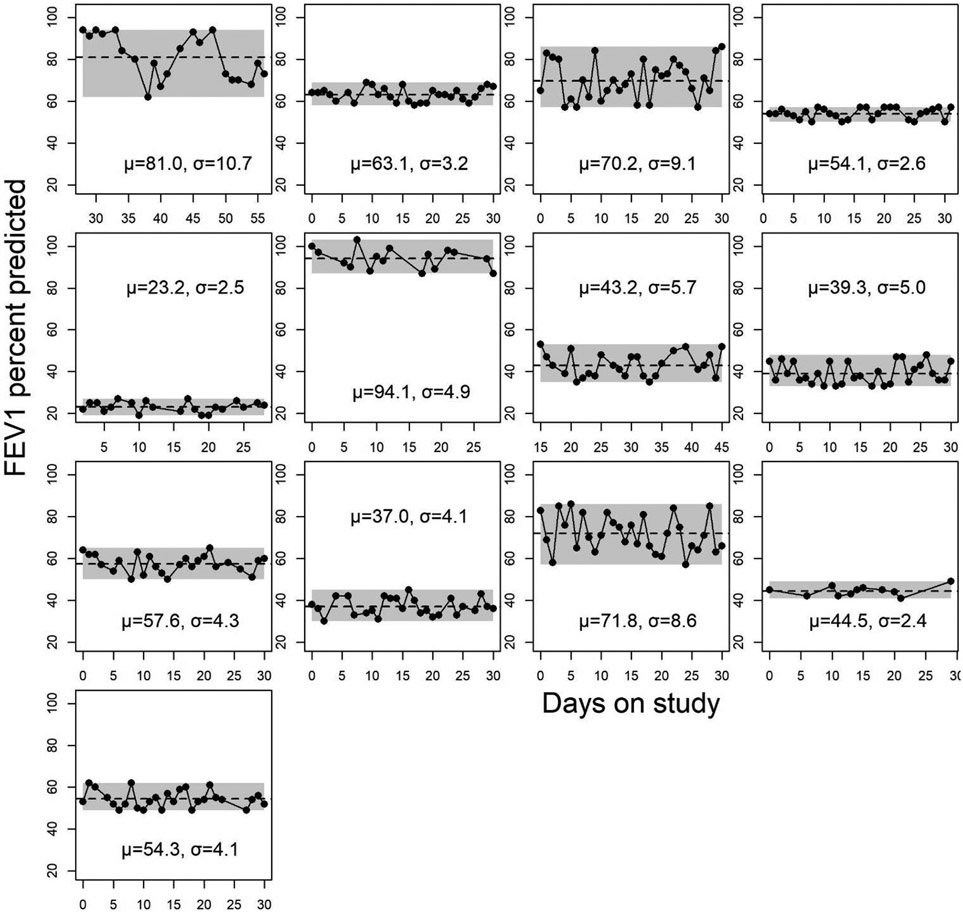 Clinical trials often demonstrate treatment efficacy through change in forced expiratory volume in one second (FEV1), comparing single FEV1 measurements from post- versus pre-treatment timepoints. Day-to-day variation in measured FEV1 is common for reasons such as diurnal variation and intermittent health changes, relative to a stable, monthly average. This variation can alter estimation of associations between change in FEV1 and baseline in predictable ways, through a phenomenon called regression to the mean. We quantify and explain day-to-day variation in percent-predicted FEV1 (ppFEV1) from 4 previous trials, and we present a statistical, data-driven explanation for potential bias in ceiling and floor effects due to commonly observed amounts of variation. We recommend accounting for variation when assessing associations between baseline value and change in CF outcomes in single-arm trials, and we consider possible impact of variation on conventional standards for study eligibility.