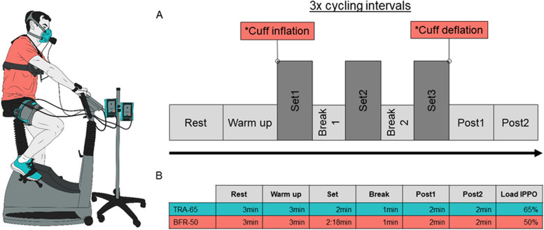 Methods: We conducted a randomized crossover study. The protocol involved three cycling intervals interspersed with 1 min resting periods. With a 48-h washout period, individuals performed the protocol twice in random order: once as BFR-50 (i.e., 50% incremental peak power output [IPPO] and 50% limb occlusion pressure [LOP]) and once as TRA-65 (65% IPPO without occlusion). TRA-65 intervals lasted 2 min, and time-matched BFR-50 lasted 2 min and 18 s. Respiratory parameters were collected by breath-by-breath analysis. The ratings of perceived breathing and leg exertion (RPE, 0 to 10) were assessed. Linear mixed models were used for analysis.