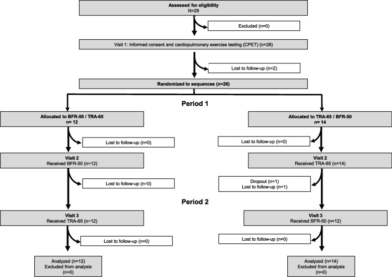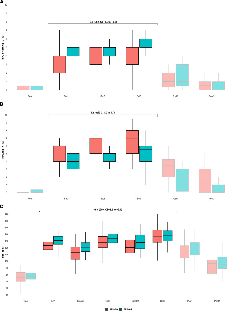 Results: Out of the 28 participants initially enrolled in the study, 24 healthy individuals (18 males and 6 females) completed both measurements. Compared with TRA-65, BFR-50 elicited lower minute ventilation (VE, primary outcome) (-3.1 l/min [-4.4 to -1.7]), oxygen consumption (-0.22 l/min [-0.28 to -0.16]), carbon dioxide production (-0.25 l/min [-0.29 to -0.20]) and RPE breathing (-0.9 [-1.2 to -0.6]). RPE leg was significantly greater in the BFR-50 group (1.3 [1.0 to 1.7]).