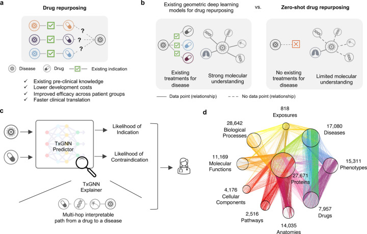 Drug repurposing - identifying new therapeutic uses for approved drugs - is often serendipitous and opportunistic, expanding the use of drugs for new diseases. The clinical utility of drug repurposing AI models remains limited because the models focus narrowly on diseases for which some drugs already exist. Here, we introduce TXGNN, a graph foundation model for zero-shot drug repurposing, identifying therapeutic candidates even for diseases with limited treatment options or no existing drugs. Trained on a medical knowledge graph, TXGNN utilizes a graph neural network and metric-learning module to rank drugs as potential indications and contraindications across 17,080 diseases. When benchmarked against eight methods, TXGNN improves prediction accuracy for indications by 49.2% and contraindications by 35.1% under stringent zero-shot evaluation. To facilitate model interpretation, TXGNN's Explainer module offers transparent insights into multi-hop medical knowledge paths that form TXGNN's predictive rationales. Human evaluation of TXGNN's Explainer showed that TXGNN's predictions and explanations perform encouragingly on multiple axes of performance beyond accuracy. Many of TxGNN's novel predictions align with off-label prescriptions clinicians make in a large healthcare system. TXGNN's drug repurposing predictions are accurate, consistent with off-label drug use, and can be investigated by human experts through multi-hop interpretable rationales.