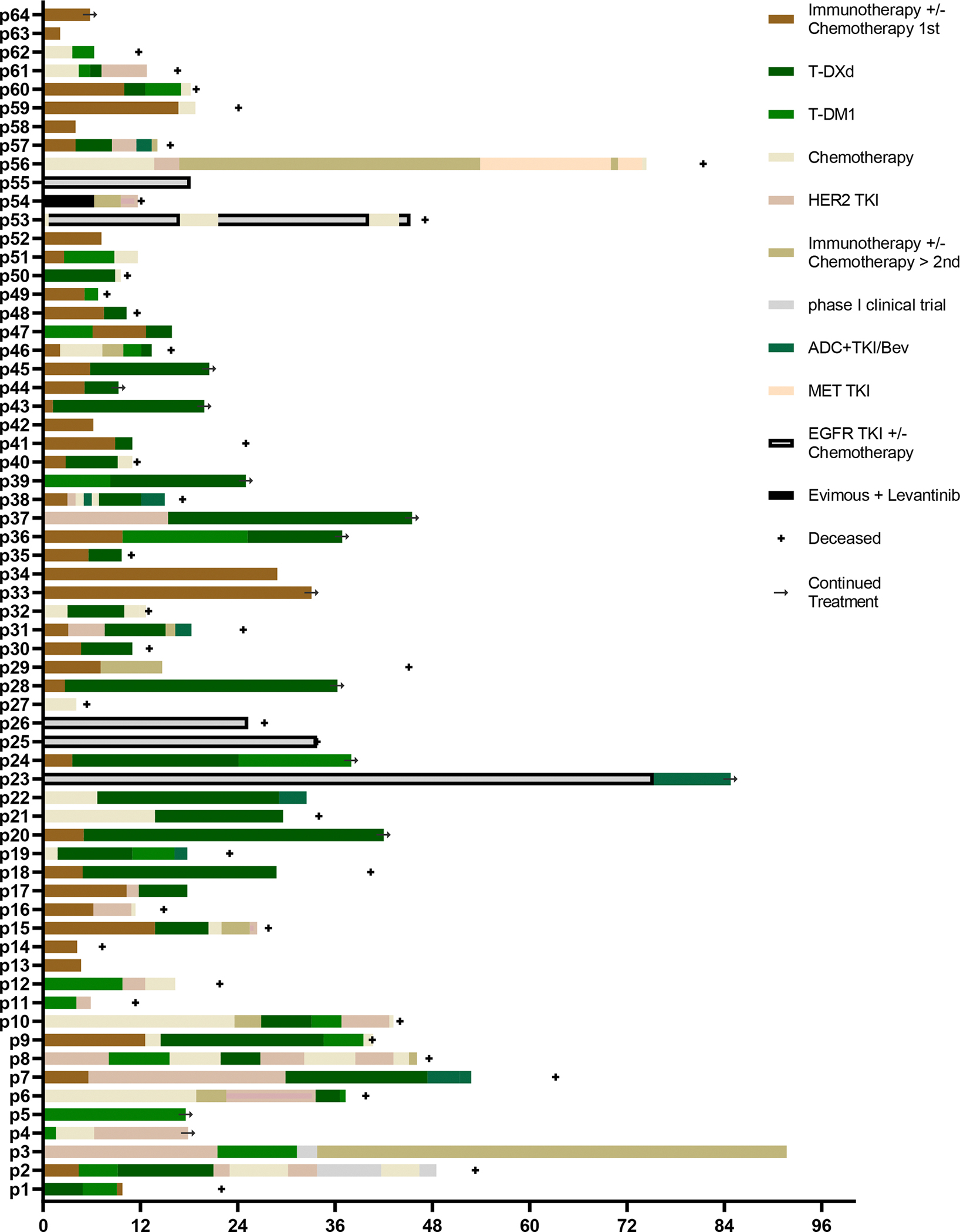 Results: Sixty-three patients were included in the primary analysis. Chemoimmunotherapy (33/63, 52.4 %) was the predominant first-line treatment with a median TTNT of 5.1 months (95 %CI 4.1 - 6.1) whereas 55.0 % (22/40) of patients who received second-line T-DXd obtained a median TTNT of 9.2 m (95 % CI, 0-22.2). Plasma ctDNA was tested before first-line therapy in 40 patients with a median OS of 28.0 months (95 % CI 21-34), in whom 31 patients (78.0 %) had detectable ctDNA. HER2 mutations were detected on ctDNA with a median turnaround time of 13 days, occasionally co-occurred with EGFR and MET alterations and were tracked longitudinally correlating with treatment response. Patients with detectable baseline ctDNA had significantly shorter OS (hazard ratio (HR), 5.25; 95 % CI, 1.2-23.9; p = 0.019).