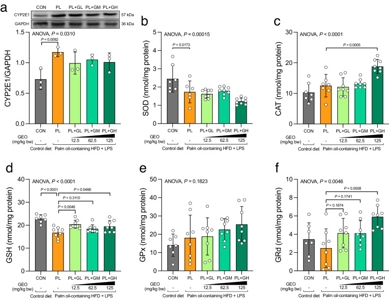 Results: GEO reduced plasma alanine aminotransferase levels and hepatic pro-inflammatory cytokine levels; and increased antioxidant catalase, glutathione reductase, and glutathione levels to prevent NASH. GEO alleviated hepatic inflammation through mediated NLR family pyrin domain-containing 3 (NLRP3) inflammasome and LPS/Toll-like receptor four (TLR4) signaling pathways. GEO further increased beneficial bacterial abundance and reduced NASH-associated bacterial abundance.
