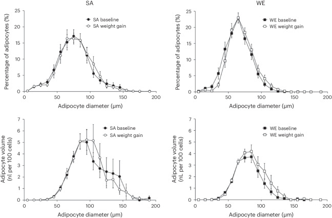 South Asians (SAs) develop type 2 diabetes at lower body mass index values than white Europeans (WEs). This basic human experimental study aimed to compare the metabolic consequences of weight gain in SA and WE men without overweight or obesity. Fourteen SAs and 21 WEs had assessments of body composition, metabolic responses to mixed-meal ingestion, cardiorespiratory fitness and physical activity, and a subcutaneous abdominal adipose tissue biopsy, before and after 4-6 weeks of overfeeding to induce 5-7% weight gain. Here we show that body mass index and whole-body adipose tissue volume increases similarly between ethnic groups, but SAs gain less lean tissue. SAs experience a substantially greater decrease in insulin sensitivity compared with WEs (38% versus 7% decrease, P = 0.009), have fewer small (37.1% versus 60.0%, P = 0.003) and more large (26.2% versus 9.1%, P = 0.005) adipocytes at baseline and have a smaller decrease in very small adipocytes with weight gain (-0.1% versus -1.9%, P < 0.0001). Ethnic differences in adipocyte morphology are associated with SA's greater adverse metabolic changes with weight gain. ClinicalTrials.gov registration: NCT02399423 .