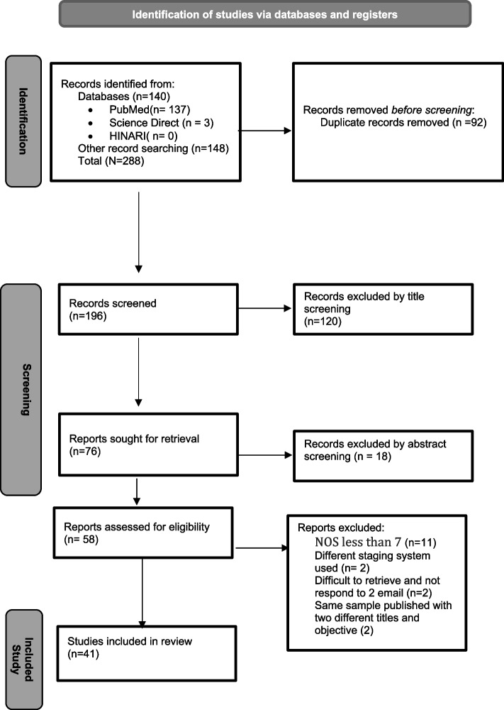 Methods: By using key terms, Medline through Pub-Med, Google Scholar, Science Direct, HINARI and Medley were searched about breast cancer in Ethiopia, and a total of 288 articles were retrieved. After screening the articles and quality of each article was assessed using Newcastle-Ottawa Scale. Finally, 41 articles were used for the final pooled proportion. A random effects model was used to estimate the pooled prevalence and heterogeneity of included studies that were then assessed by using prediction interval.