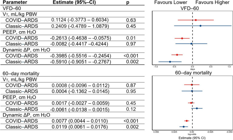 Results: This analysis included 6702 COVID-ARDS patients and 1415 CLASSIC-ARDS patients. COVID-ARDS patients received lower median VT (6.6 [6.0 to 7.4] vs 7.3 [6.4 to 8.5] ml/kg PBW; p < 0.001) and higher median PEEP (12.0 [10.0 to 14.0] vs 8.0 [6.0 to 10.0] cm H2O; p < 0.001), at lower median ΔP (13.0 [10.0 to 15.0] vs 16.0 [IQR 12.0 to 20.0] cm H2O; p < 0.001) and higher median Crs (33.5 [26.6 to 42.1] vs 28.1 [21.6 to 38.4] mL/cm H2O; p < 0.001). Following multivariable adjustment, higher ΔP had an independent association with higher 60-day mortality and less VFD-60 in both groups. Higher PEEP had an association with less VFD-60, but only in COVID-ARDS patients.