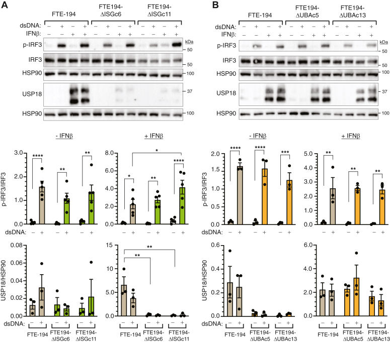 Heritable mutations in BRCA1 associate with increased risk of high-grade serous tubo-ovarian cancer. Nongenetic risk factors associated with this cancer, which arises from fallopian tube epithelial (FTE) cells, suggests a role for repetitive ovulation wherein FTE cells are exposed to inflammatory signaling molecules within follicular fluid. We previously reported increased NFκB and EGFR signaling in BRCA1-deficient primary FTE cells, with follicular fluid exposure further increasing abundance of interferon-stimulated gene (ISG) transcripts, including the ubiquitin-like protein ISG15 and other ISGylation pathway members. Both NFκB and type I interferon signaling are upregulated by stimulation of cGAS-STING or MDA5 and RIGI pattern recognition receptors. Since some pattern recognition receptors and their signal transduction pathway members are ISGylated, we tested the impact of ISG15 and ISGylation on interferon regulatory factor 3 (IRF3) and NFκB signaling through cGAS-STING or RIGI and MDA5 activation. Expression of ISG15 or UBA7, the E1-like ISG15-activating enzyme, in immortalized FTE cells was disrupted by CRISPR gene editing. Activation of IRF3 by RIGI or MDA5 but not cGAS-STING was attenuated by loss of either ISG15 or UBA7 and this was reflected by a similar effect on NFκB activation and downstream targets. Loss of ISGylation decreased levels of both MDA5 and RIGI, with knockdown of RIGI but not MDA5, decreasing IRF3 and NFκB activation in parental cells. These finding indicate that ISGylation enhances the ability of dsRNA to activate cytokine release and proinflammatory signaling. Further work to explore ISGylation as a target for prevention of high-grade serous tubo-ovarian cancer in BRCA1 mutation carriers is warranted.