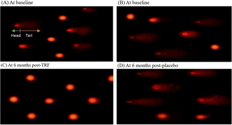 Results: APO-A1 and AST levels decreased significantly from 1.39 ± 0.3 to 1.22 ± 0.2 g/L (P = 0.002) and from 30 ± 12 to 22 ± 10 g/L (P = 0.038), respectively, in the TRF group post-intervention. Hepatic steatosis was significantly reduced in the placebo group from 309.38 ± 53.60 db/m to 277.62 ± 39.55 db/m (p = 0.048), but not in the TRF group. Comet assay analysis showed a significant reduction in the DNA damage parameters in the TRF group in the post-intervention period compared to the baseline, with tail length decreasing from 28.34 ± 10.9 to 21.69 ± 9.84; (p = 0.049) and with tail DNA (%) decreasing from 54.13 ± 22.1to 46.23 ± 17.9; (p = 0.043). Pro-inflammatory cytokine expression levels were significantly lower in the TRF group compared to baseline levels for IL-6 (2.10 6.3 to 0.7 1.0 pg/mL; p = 0.047 pg/mL) and TNF-1 (1.73 5.5 pg/mL to 0.7 0.5 pg/mL; p = 0.045).