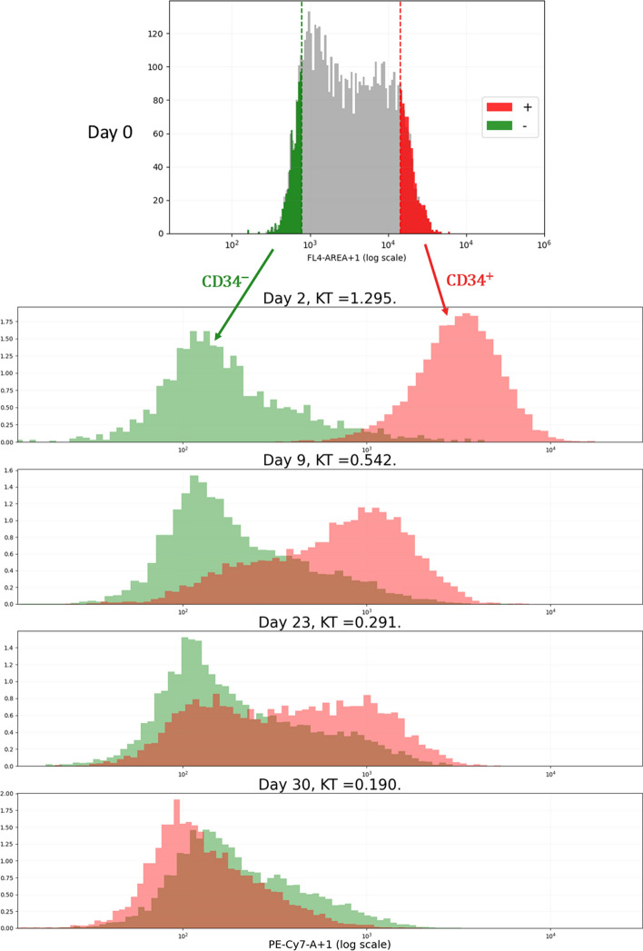 Results: In order to confront our model with experimental data, we generated a relaxation experiment of the CD34 antigen on the surface of TF1-BA cells, starting either from the highest or the lowest CD34 expression levels. We observed in both cases that after approximately 25 days the distribution of CD34 returns to its initial stationary state. Numerical simulations, based on parameter values estimated from the dataset, have shown that the model solutions closely align with the experimental data from the relaxation experiments.