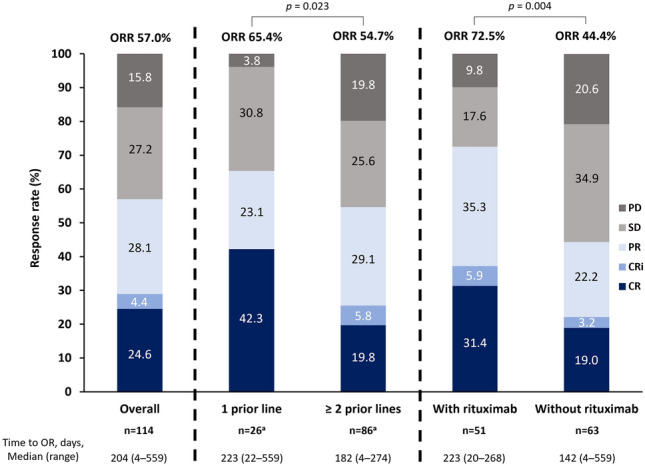 Venetoclax was approved for relapsed/refractory chronic lymphocytic leukemia (R/R CLL) and small lymphocytic leukemia (SLL) in Japan in September 2019; however, clinical data in Japanese patients are limited. This all-case post-marketing surveillance assessed efficacy and safety in Japanese patients with R/R CLL/SLL who started venetoclax treatment between November 2019 and August 2020. Overall, the safety and efficacy analysis sets included 129 and 114 patients, respectively. The overall response rate (ORR) was 57.0%; ORRs were higher in patients with versus without concomitant rituximab (65.4% vs. 54.7%), and in patients with 1 versus ≥ 2 prior lines of therapies (72.5% vs. 44.4%). Adverse events (AEs) were reported in 66.7% of patients (86/129); the most common AEs were neutrophil count decreased (22.5%), white blood cell count decreased (7.8%), and tumor lysis syndrome (TLS; 6.2%). AEs of special interest (TLS, myelosuppression, and infection) were manageable in clinical practice in Japan. Venetoclax is efficacious and safe for R/R CLL/SLL patients in the real-world setting in Japan. ClinicalTrials.gov ID: NCT04198415.