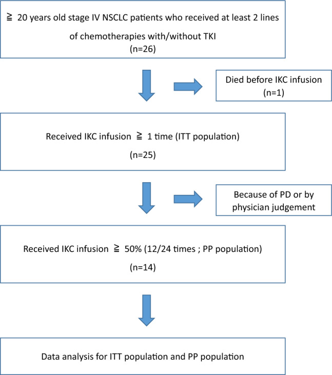 The 5-year survival is poor for stage IV non-small cell lung cancer (NSCLC). Recently, cell immunotherapy has emerged as a new treatment strategy. This study aimed to evaluate the efficacy and safety of Immune killer cells (IKC) in patients with stage IV NSCLC after the failure of prior chemotherapy. This study enrolled 26 patients with stage IV NSCLC who failed at least two lines of chemotherapy with or without targeted therapy. The IKC was given alone weekly for 24 weeks. The primary endpoint was progression-free survival (PFS). Secondary outcomes included overall survival (OS), pain intensity, quality of life (QOL), and safety. The median PFS for the intent-to-treat (ITT) population (i.e., all enrolled patients) was 3.8 month. In the per-protocol (PP) population (i.e., patients receiving > 12 IKC infusions), the median PFS was 5.6 months. Moreover, the ITT population showed a 1-year survival rate of 60.0%, while that for the PP population was 85.7%. Only 7 out of 200 AEs (3.5%) were related to the IKC infusion, and they were all rated as grade 1 in severity. The IKC infusion was well tolerated. This novel immunotherapy prolonged the PFS and improved the survival compared with historical data. It might be a potential treatment strategy for stage IV NSCLC patient who failed prior chemotherapy.ClinicalTrials.gov identifier: NCT03499834.
