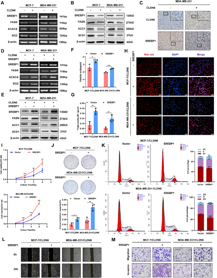 Background: Breast cancer (BC) ranks as the third most fatal malignant tumor worldwide, with a strong reliance on fatty acid metabolism. CLDN6, a candidate BC suppressor gene, was previously identified as a regulator of fatty acid biosynthesis; however, the underlying mechanism remains elusive. In this research, we aim to clarify the specific mechanism through which CLDN6 modulates fatty acid anabolism and its impact on BC growth and metastasis.