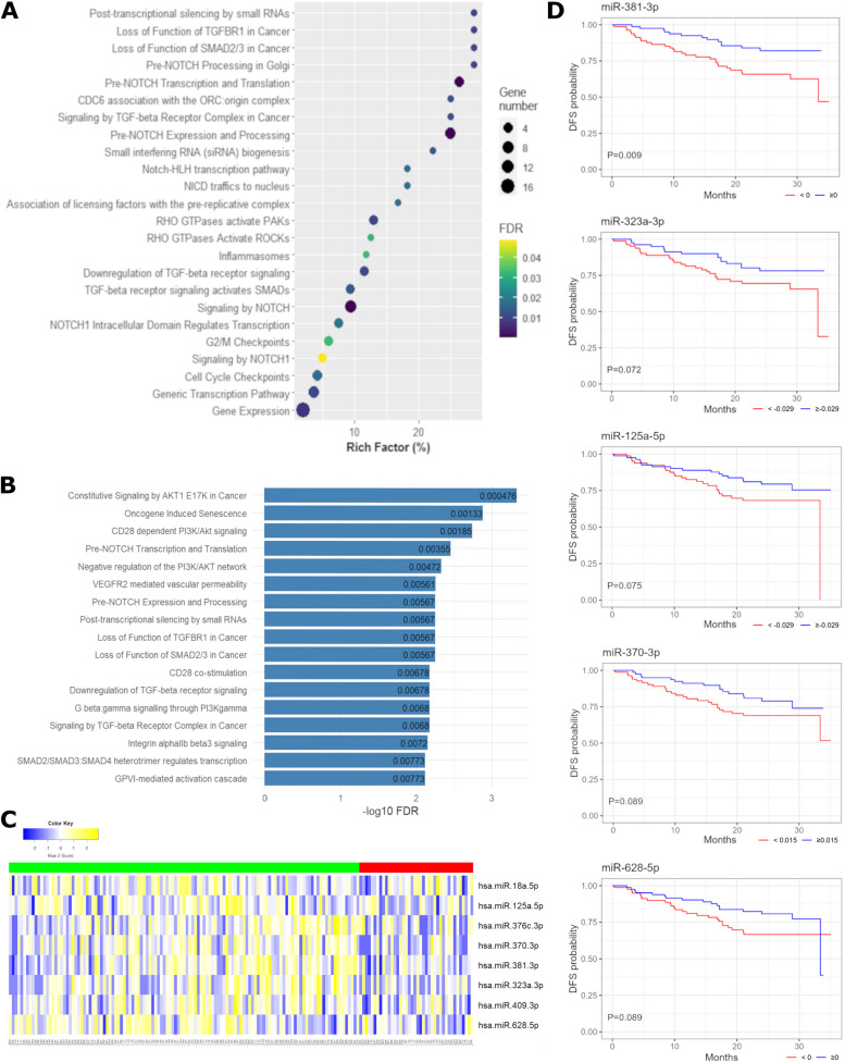 Results: A total of 222 patients were enrolled. The median follow-up time was 26.3 (95% CI 25.4-27.6) months. From Model 1, three CF-miRNAs and 21 EV-miRNAs were associated with DFS. In Model 2, two CF-miRNAs (miR-29c-3p and miR-877-3p) and five EV-miRNAs (miR-181a-2-3p, miR-182-5p, miR-192-5p, miR-532-3p and miR-589-5p) remained associated with DFS. From pathway enrichment analysis, TGF-beta and NOTCH were the most involved pathways.