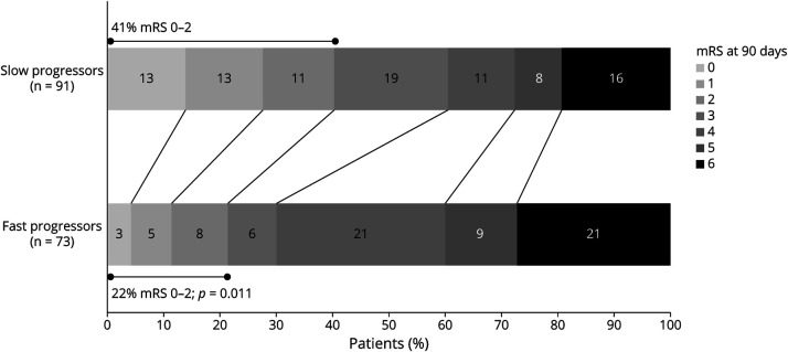 Results: A total of 183 patients with a median age of 74 years (interquartile range 61-82), of whom 99 (54%) were male and 82 (45%) were fast progressors, were included. At baseline, fast progressors had a higher NIH Stroke Scale score (median 16 vs 13), lower cerebral blood volume index (median 0.80 vs 0.89), more commonly poor collaterals on CT angiography (35% vs 13%), higher hypoperfusion intensity ratios (HIRs) (median 0.51 vs 0.34), and larger core volumes (median 11.80 mL vs 0.00 mL). In multivariable analysis, higher HIR (adjusted odds ratio [aOR] for every 0.10 increase 1.32 [95% CI 1.10-1.59]) and larger core volume (aOR for every 10 mL increase 1.54 [95% CI 1.20-2.11]) remained independently associated with fast IGR.