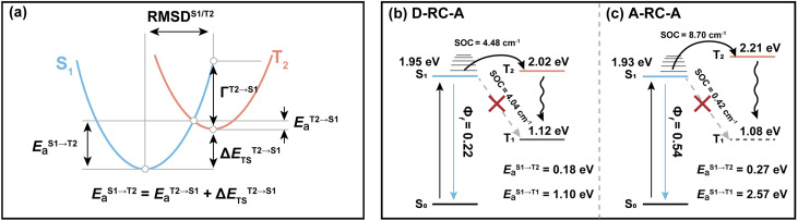 2,5-Bis(phenylethynyl) rhodacyclopentadienes (RCPDs), as a type of Rh(iii) complex, exhibit unusually intense fluorescence and slow intersystem crossing (ISC) due to weak metal-ligand interactions. However, details on their ultrafast photophysics and ISC dynamics are limited. In this work, electronic relaxation upon photoexcitation of two substituted RCPDs with two -CO2Me (A-RC-A) or -NMe2/-CO2Me (D-RC-A) end groups are comprehensively investigated using femtosecond transient absorption spectroscopy and theoretical analysis. Upon ultraviolet and visible excitation, dephasing of vibrational coherence, charge transfer, conformation relaxation, and ISC are observed experimentally. By calculating the spin-orbit coupling, reorganization energy, and adiabatic energy gap of plausible ISC channels, semi-classical Marcus theory revealed the dominance of thermally activated ISC (S1 → T2) for both D-RC-A and A-RC-A, while S1 → T1 channels are largely blocked due to high ISC barriers. With weak spin-orbit coupling, such differences in plausible ISC channels are predominately tuned by energetic parameters. Singlet oxygen sensitization studies of A-RC-A provide additional insight into the excited-state behavior of this complex.