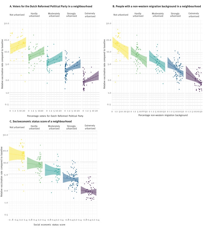 BackgroundVaccine uptake differs between social groups. Mobile vaccination units (MV-units) were deployed in the Netherlands by municipal health services in neighbourhoods with low uptake of COVID-19 vaccines.AimWe aimed to evaluate the impact of MV-units on vaccine uptake in neighbourhoods with low vaccine uptake.MethodsWe used the Dutch national-level registry of COVID-19 vaccinations (CIMS) and MV-unit deployment registrations containing observations in 253 neighbourhoods where MV-units were deployed and 890 contiguous neighbourhoods (total observations: 88,543 neighbourhood-days). A negative binomial regression with neighbourhood-specific temporal effects using splines was used to study the effect.ResultsDuring deployment, the increase in daily vaccination rate in targeted neighbourhoods ranged from a factor 2.0 (95% confidence interval (CI): 1.8-2.2) in urbanised neighbourhoods to 14.5 (95% CI: 11.6-18.0) in rural neighbourhoods. The effects were larger in neighbourhoods with more voters for the Dutch conservative Reformed Christian party but smaller in neighbourhoods with a higher proportion of people with non-western migration backgrounds. The absolute increase in uptake over the complete intervention period ranged from 0.22 percentage points (95% CI: 0.18-0.26) in the most urbanised neighbourhoods to 0.33 percentage point (95% CI: 0.28-0.37) in rural neighbourhoods.ConclusionDeployment of MV-units increased daily vaccination rate, particularly in rural neighbourhoods, with longer travel distance to permanent vaccination locations. This public health intervention shows promise to reduce geographic and social health inequalities, but more proactive and long-term deployment is required to identify its potential to substantially contribute to overall vaccination rates at country level.