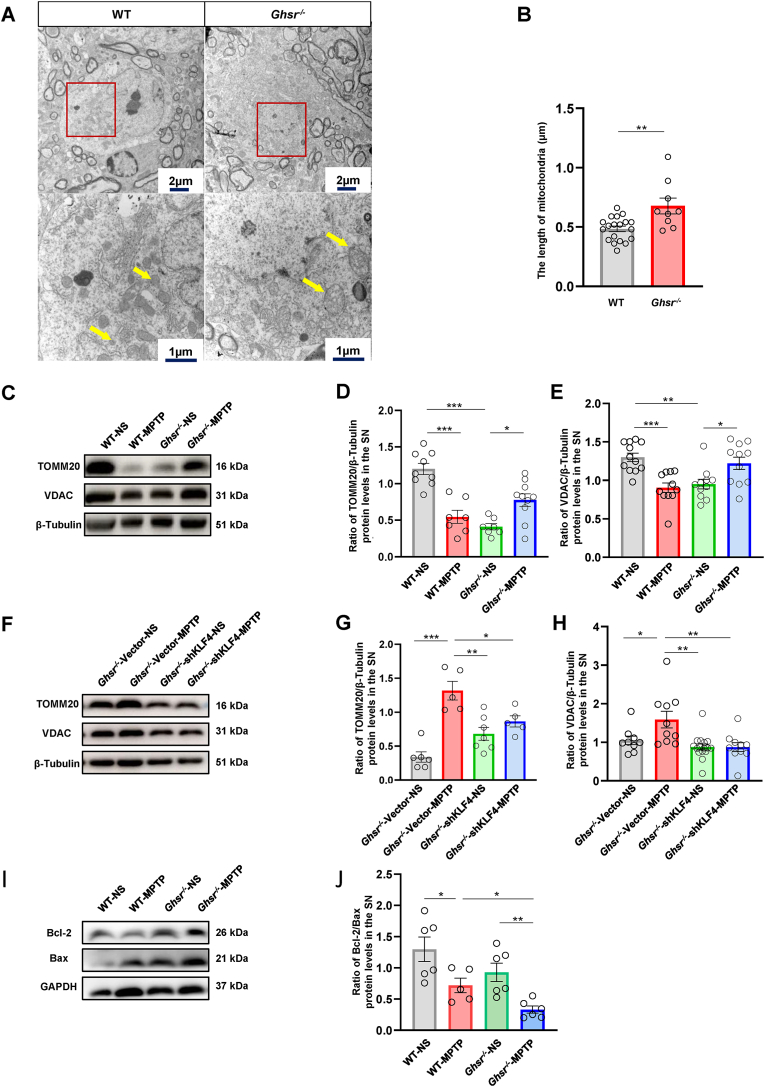 In Parkinson's disease (PD), exogenous ghrelin protects dopaminergic neurons through its receptor, growth hormone secretagogue receptor (GHSR). However, in contrast to the strikingly low levels of ghrelin, GHSR is highly expressed in the substantia nigra (SN). What role does GHSR play in dopaminergic neurons is unknown. In this study, using GHSR knockout mice (Ghsr-/- mice) and 1-methyl-4-phenyl-1,2,3,6-tetrahydropyridine (MPTP)-induced PD model, we found that GHSR deletion aggravated dopaminergic neurons degeneration, and the expression and activity of GHSR were significantly reduced in PD. Furthermore, we explored the potential mechanism that GHSR deficiency aggregated PD-related neurodegeneration. We showed that DEPTOR, a subunit of mTORC1, was overexpressed in Ghsr-/- mice, positively regulating autophagy and enhancing autophagy initiation. The expression of lysosomal markers was abnormal, implying lysosomal dysfunction. As a result, the damaged mitochondria could not be effectively eliminated, which ultimately exacerbated the injury of nigral dopaminergic neurons. In particular, we demonstrated that DEPTOR could be transcriptionally regulated by KLF4. Specific knockdown of KLF4 in dopaminergic neurons effectively alleviated neurodegeneration in Ghsr-/- mice. In summary, our results suggested that endogenous GHSR deletion-compromised autophagy by impairing lysosomal function, is a key contributor to PD, which provided ideas for therapeutic approaches involving the manipulation of GHSR.