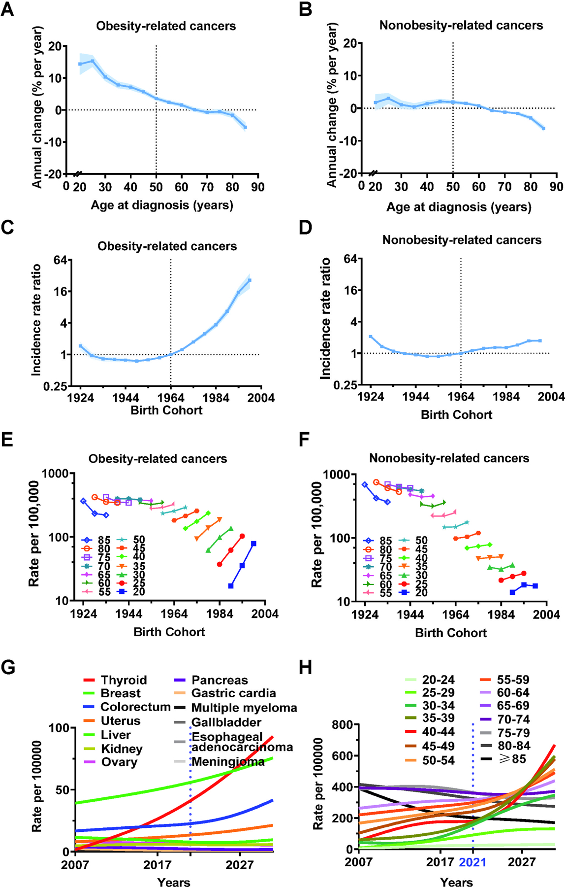 Findings: Among 651,342 cancer cases, 48.47% were obesity related. The age-standardized incidence rates (ASRs) of the 12 obesity-related cancers increased annually by 3.6% (p < 0.001), while ASRs for non-obesity-related cancers remained stable. Obesity-related cancers surged among younger adults, with rates rising across successive generations. The annual percentage of change decreased with age, from 15.28% for ages 25-29 years to 1.55% for ages 60-64 years. The incidence rate ratio for obesity-related cancer was higher in younger generations compared to those born in 1962-1966. We predict that the ASR for obesity-related cancers will nearly double in the next decade.