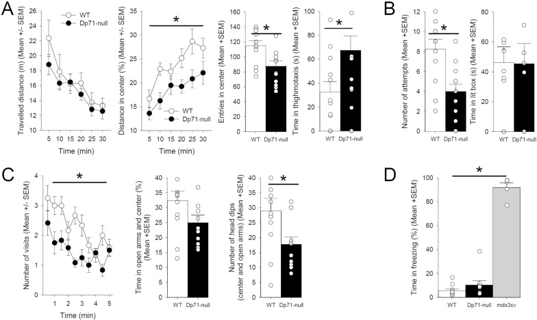 Background: The Duchenne and Becker muscular dystrophies (DMD, BMD) are neuromuscular disorders commonly associated with diverse cognitive and behavioral comorbidities. Genotype-phenotype studies suggest that severity and risk of central defects in DMD patients increase with cumulative loss of different dystrophins produced in CNS from independent promoters of the DMD gene. Mutations affecting all dystrophins are nevertheless rare and therefore the clinical evidence on the contribution of the shortest Dp71 isoform to cognitive and behavioral dysfunctions is limited. In this study, we evaluated social, emotional and locomotor functions, and fear-related learning in the Dp71-null mouse model specifically lacking this short dystrophin.