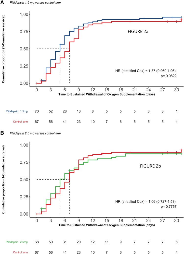 Methods: Included patients had documented severe acute respiratory syndrome coronavirus 2 infection, required oxygen therapy, and had adequate organ function. The planned sample size was 609 patients. Patients were randomized 1:1:1 to at least 3 days of dexamethasone plus either plitidepsin (1.5 mg/day or 2.5 mg/day, for 3 days) or standard of care (control). The primary endpoint was the time to sustained withdrawal of supplemental oxygen. Secondary endpoints included time to sustained hospital discharge, clinical status, duration of oxygen support, percentage of patients requiring admission to the intensive care unit, and safety.