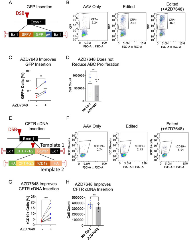 Cystic fibrosis (CF) is caused by mutations in the cystic fibrosis transmembrane conductance regulator (CFTR) gene. Although many people with CF (pwCF) are treated using CFTR modulators, some are non-responsive due to their genotype or other uncharacterized reasons. Autologous airway stem cell therapies, in which the CFTR cDNA has been replaced, may enable a durable therapy for all pwCF. Previously, CRISPR-Cas9 with two AAVs was used to sequentially insert two halves of the CFTR cDNA and an enrichment cassette into the CFTR locus. However, the editing efficiency was <10% and required enrichment to restore CFTR function. Further improvement in gene insertion may enhance cell therapy production. To improve CFTR cDNA insertion in human airway basal stem cells (ABCs), we evaluated the use of the small molecules AZD7648 and ART558 which inhibit non-homologous end joining (NHEJ) and micro-homology mediated end joining (MMEJ). Adding AZD7648 alone improved gene insertion by 2-3-fold. Adding both ART558 and AZD7648 improved gene insertion but induced toxicity. ABCs edited in the presence of AZD7648 produced differentiated airway epithelial sheets with restored CFTR function after enrichment. Adding AZD7648 did not increase off-target editing. Further studies are necessary to validate if AZD7648 treatment enriches cells with oncogenic mutations.